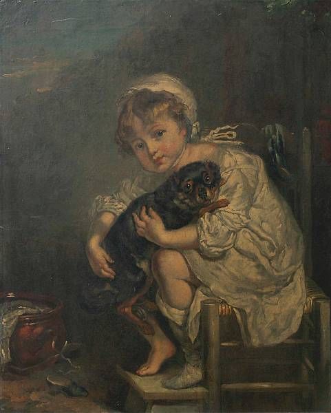 La petite fille en camisole qui tient entre ses genoux un chien noir, avec lequel elle joue