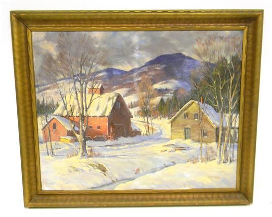 | wintery landscape of a country road cut through a farmstead and continuing up the mountain ridge, red barn and country house in | |