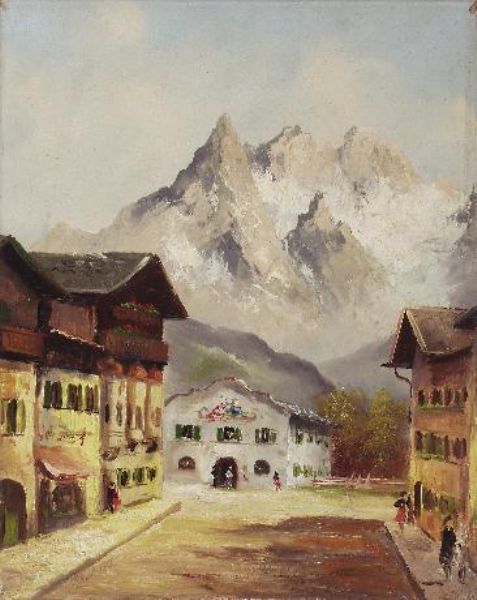 Dorfstraße in den Alpen - im Hintergrund: Blick auf ein Gebirgsmassiv