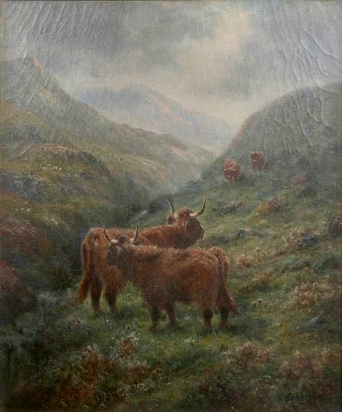 Highland cattle grazing by a stream
