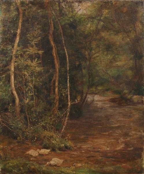 A woodland stream, with ducks to the foreground
