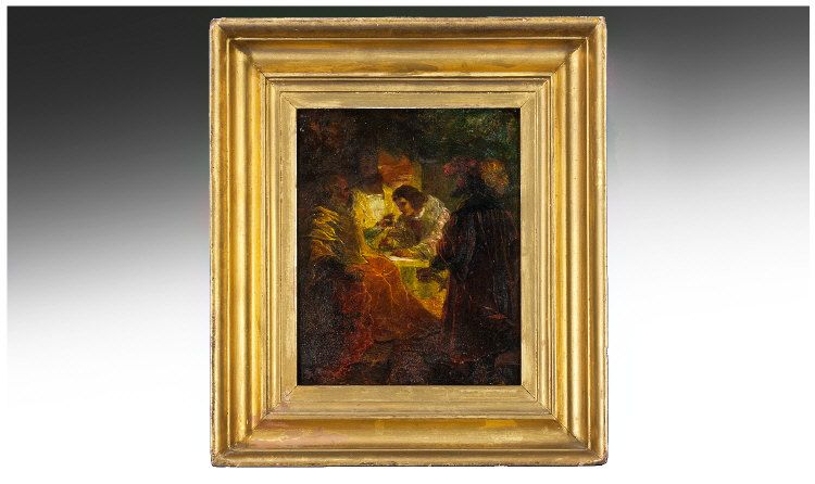 A Messenger In Feathered Hat & Cloak Watching A Scribe Write a Letter