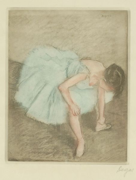 | Danseuse Assise (Seated Dancer), a ballerina seated on a bench leaning down to massage her left foot. | |
