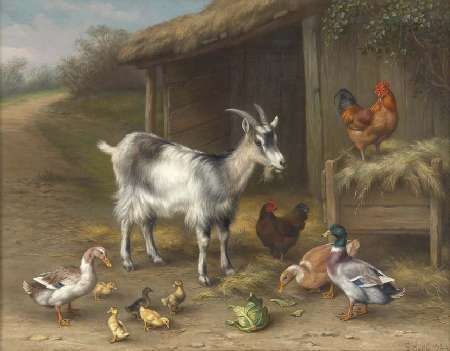GOAT, DUCKS AND CHICKENS OUTSIDE A BARN