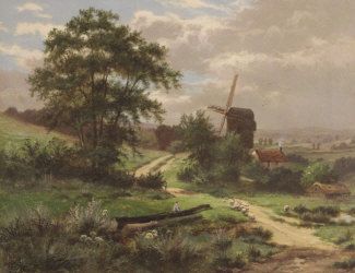 Extensive landscape with windmill, sheep and figure in foreground