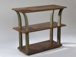 | Desserte à triple plateaux en placage de loupe d’amboine, à huit montants latéraux en acier martelé | |
