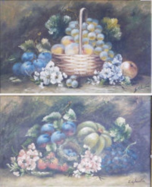 A pair of still lives with fruit and flowers.