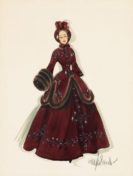| Costume design for Olivia de Havilland as Catherine Sloper in "The Heiress." Burgundy coat suit with hat and muff. | |