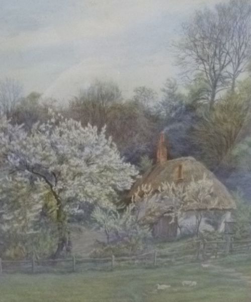 A thatched cottage in a dell with magnolia, ducks and ducklings