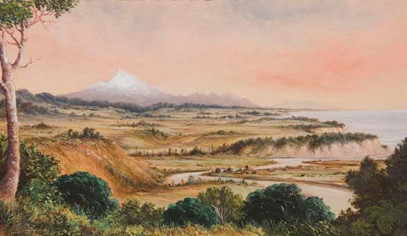 | Extensive coastal landscape of Taranaki with a Pa on the Mimi River in the foreground, Urenui township and Mt Egmont beyond | |