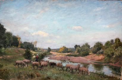 Bergère et son troupeau au bord de la rivière