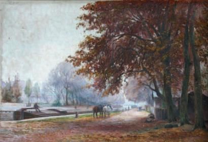 Péniche et chevaux de halage sur la Marne à Saint-Maurice