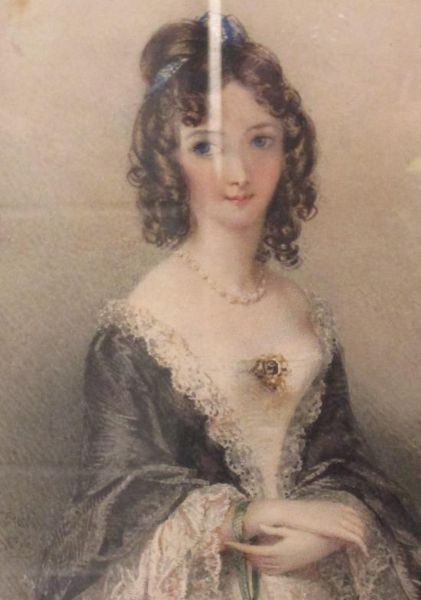 Portrait of a young lady in pearls and lace-trimmed dress