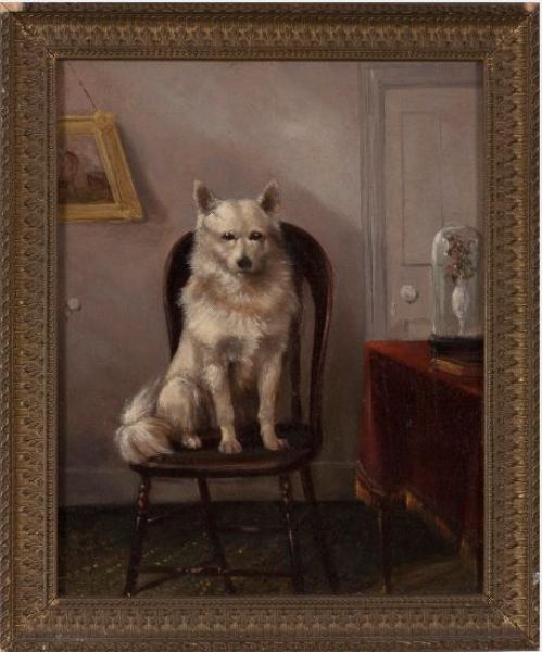 WHITE DOG SEATED IN AN INTERIOR.