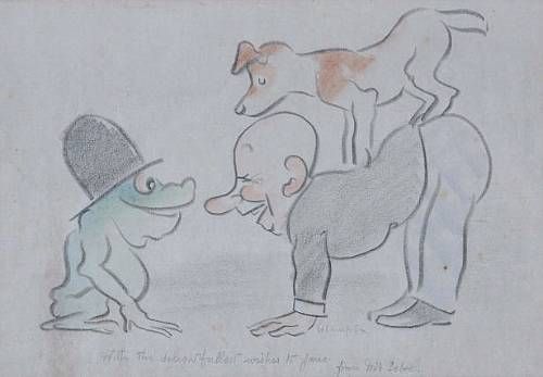 • A humorous sketch, a man on all fours with a dog standing on his back conversing with a bowler hatted frog