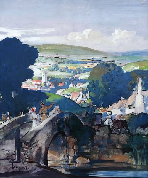 | A rural landscape in Devon, an army officer and two ladies on a stonebridge before a village, a rider and two horses nearby, fie | |