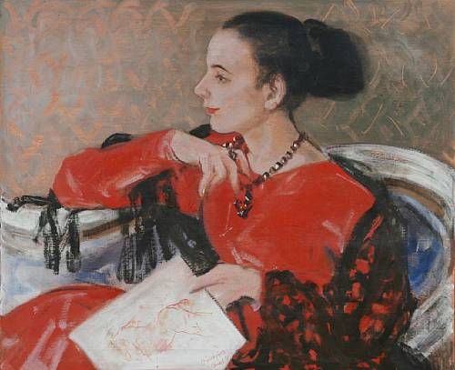 | Portrait of Patricia, seated in a chair holding in her left hand a sketch of a horse, | |