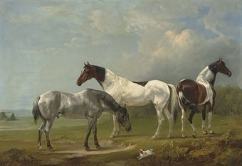 | Two Skewbalds, a grey and spaniel in an extensive landscape, a country house beyond | |