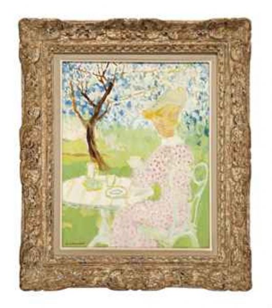 A lady taking tea in a garden