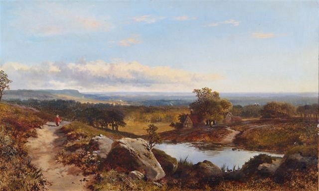 A figure on a country path beside a pond and buildings with landscape beyond