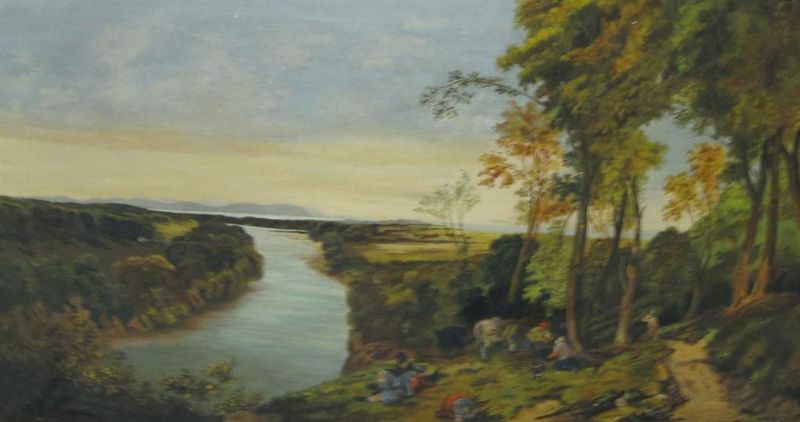 Figures gathering wood near trees, an extensive river landscape beyond,