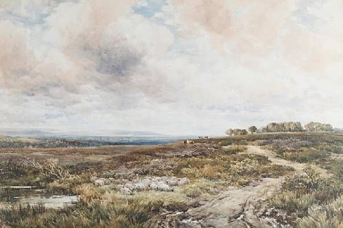 | An extensive landscape, with pond and a flock of sheep to the foreground, cattle in the distance | |