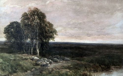 | Flock of sheep in a moorland landscape with trees to left foreground | |