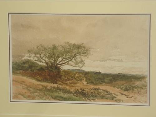 Heathland landscape with tree and figures on the horizon