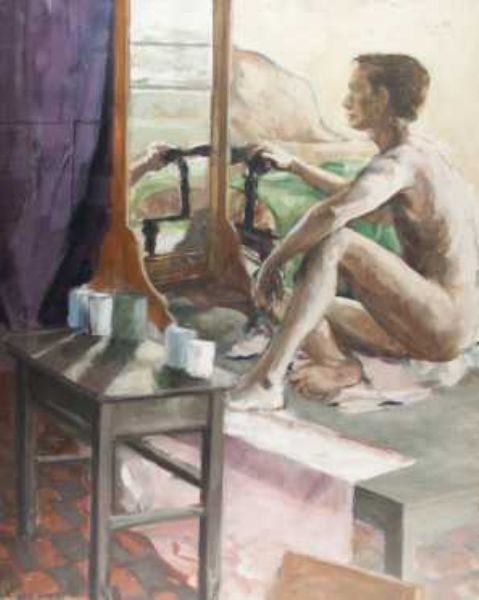 nude man watching himself in the mirror
