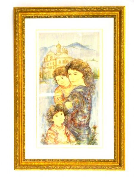 | Lithograph with added gold highlights, depicting mother and two children embracing in front of building with onion domes | |