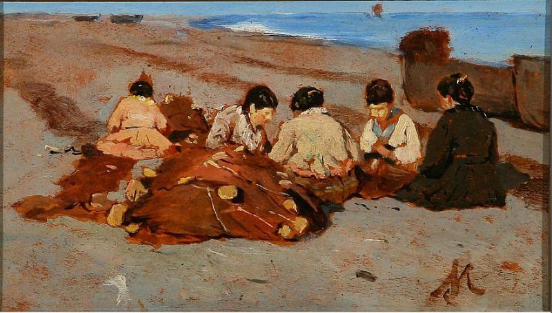 Italian fishermen's wives cleans nets on the beach