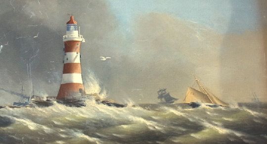 Eddystone Lighthouse with sailing vessels on a choppy sea,