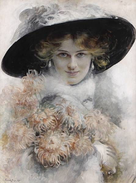 | A portrait of a lady in a black hat with a bouquet of flowers in her arms | |