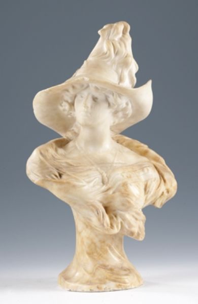 Buste de jeune femme coiffée d´un chapeau