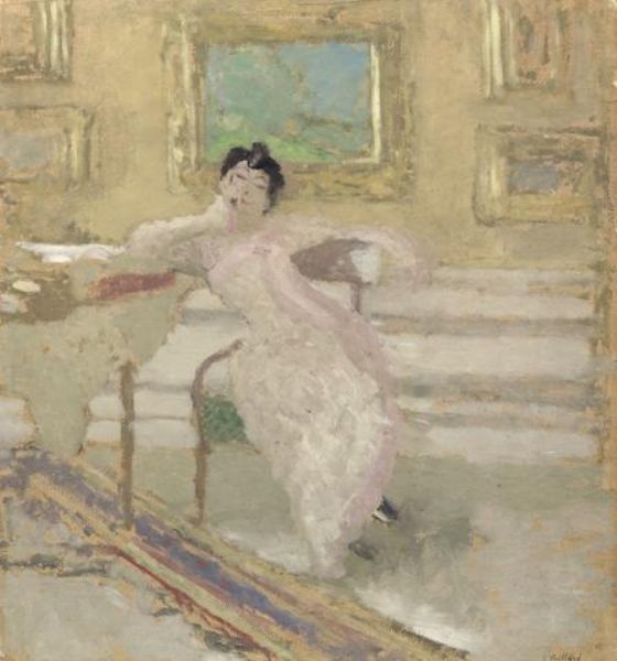 Portrait de Madame Hessel en robe rose accoudée à une table
