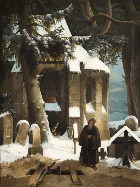 Eremit vor verschneiter Kirche