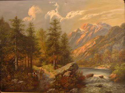 TRAVELERS ON A PATHWAY IN A MOUNTAIN LANDSCAPE