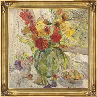 | Carnations in a vase with fruits on a bowl and assorted flowers to the side | |