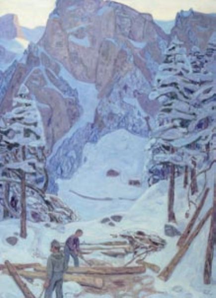 Bergtal im Winter mit Holzfällern