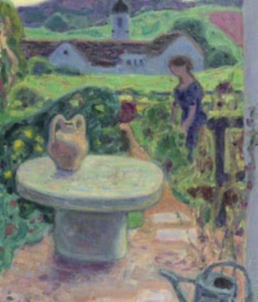 Rundes Tischchen mit Krug im Garten mit einer Frau.