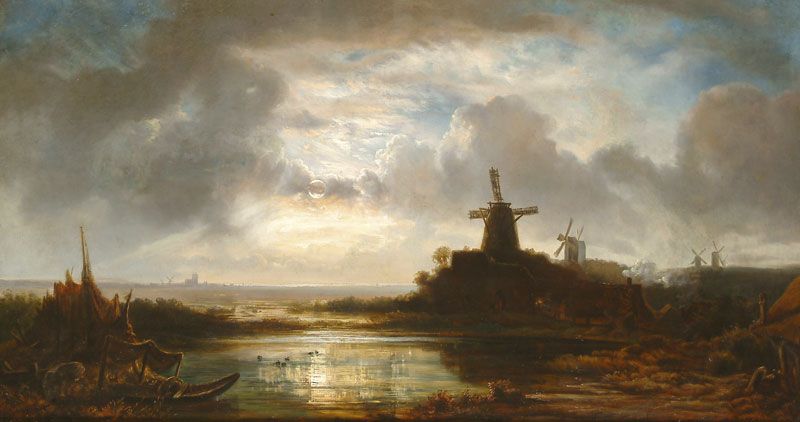 Holdfényes táj szélmalmokkal