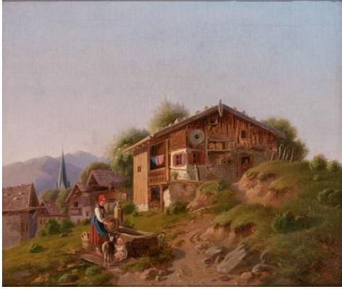 Blick auf malerisches oberbayerisches Gehöft. Mutter mit Kind am Brunnen.