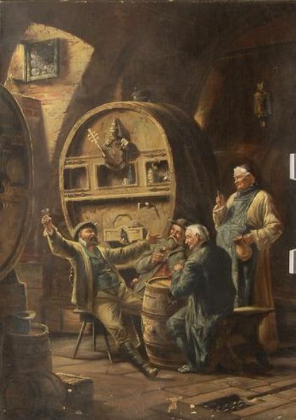An interior scene with a group of men drinking wine