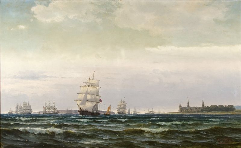 Marint motiv med segelfartyg utanför Kronborg slott.