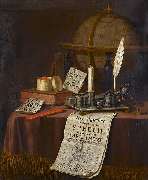 A vanitas still life with a globe, an ink well, candle, seals