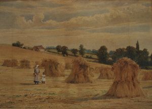 Children walking amongst haystacks in a summer landscape