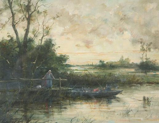 Waterlandscape with fisherman and woman at the docks
