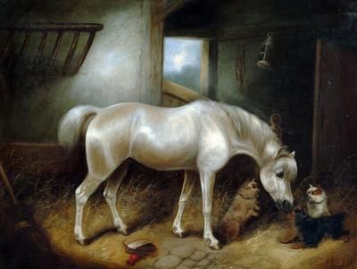 A Grey Pony in a Stable with Three Terriers