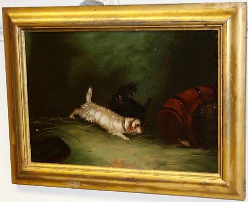 A Close Call, two Terriers chasing a rat down a hole,
