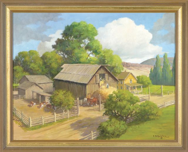 | A farm scene with two men loading hay into a barn with a house on one side and a cattle corral on the other | |